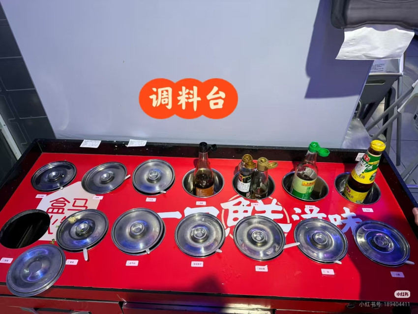 而除了充足的食材供給,在商超的堂食區,火鍋設備也一應俱全。桌上擺放著電磁爐設備,調料臺處還免費提供香油、香醋、沙茶醬等多種小料。